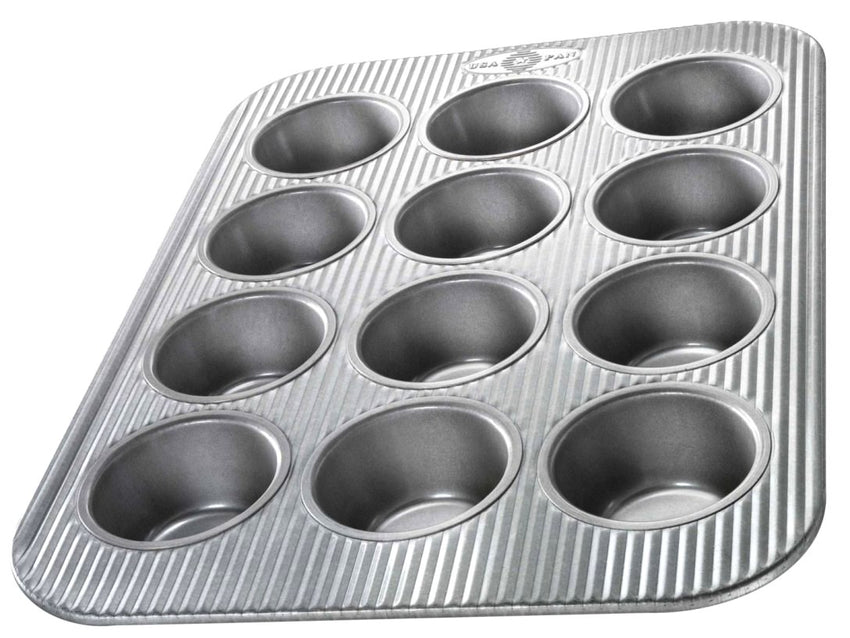 The USA Pan 12 Cup Cupcake and Muffin Pan measures a full 2.75 x 2.0625 x 1.375 inches in each cup. This pan allows you to make the perfectly sized on the go muffins or cupcakes for birthday parties. Indulge in bakery quality chocolate and vanilla cupcakes or blueberry muffins at home. The pan surface is coated with a patented AMERICOAT Plus coating, a non-stick silicone, allowing you to easily release your baked goods from the pan. AMERICOAT Plus is PTFE, PFOA and BPA free. Every USA Pan is made in the USA and has been designed with the same standard high performance features that commercial bakers enjoy including aluminized steel and heavy gauge steel construction that allows for even heat distribution and maximum service life.
