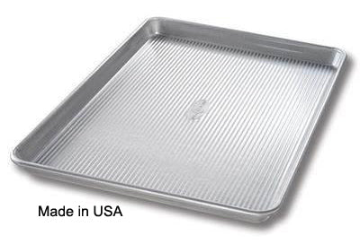 13 inch by 9 inch quarter baking sheet pan constructed of nonstick aluminized steel. Bake cookies, pastries, biscuits, rolls, pizza, fries, sandwiches, jelly rolls, fudge, or candy. The thickness of the metal allows for even heat distribution up to 400 degrees F. Steel wires built into the pans provide additional strength and prevents warping. The clear nonstick silicone coating is PTFE and PFOA free. USA Pan is the largest manufacturer of commercial bakeware in the world and has been producing professional grade pans for over 50 years. The exclusive ridged surface circulates air all around the food providing a continuously even baking temperature for uniform results. MADE IN USA with a limited lifetime manufacturer’s warranty.