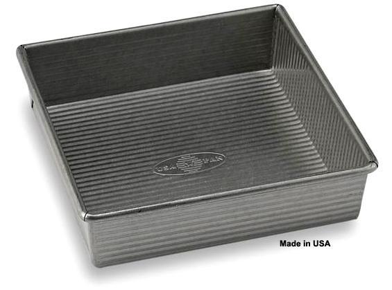 8 inch square cake pan constructed of nonstick aluminized steel. The thickness of the metal allows for even heat distribution up to 400 degrees F. Steel wires built into the pans provide additional strength and prevents warping. The clear nonstick silicone coating is PTFE and PFOA free. USA Pan is the largest manufacturer of commercial bakeware in the world and has been producing professional grade pans for over 50 years. The exclusive ridged surface circulates air all around the food providing a continuously even baking temperature for uniform results.