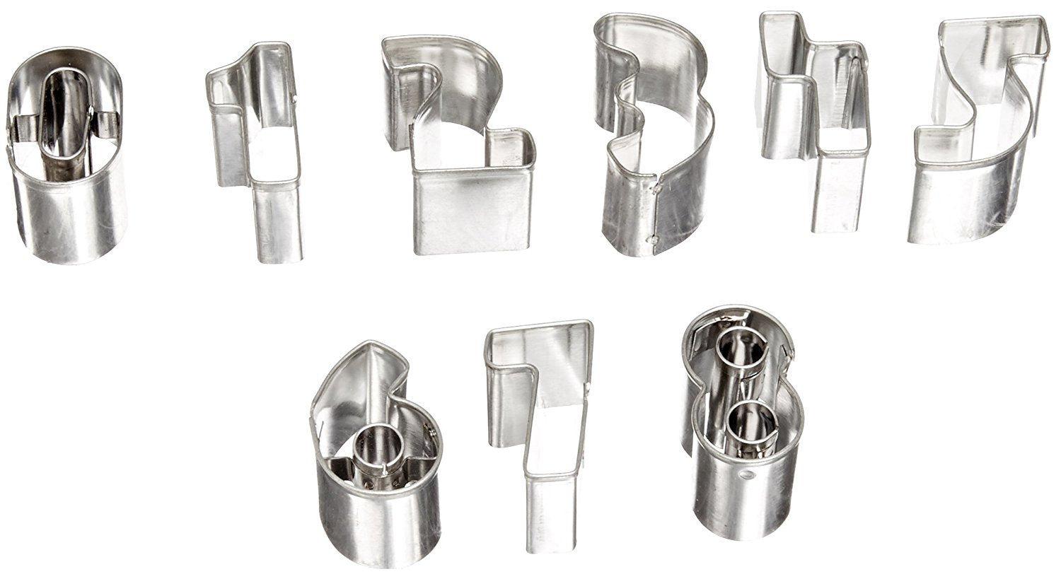 Mini 9 piece Numbers Cookie Cutter set. 1" cutters include numbers 0 - 9. Nice addition to any cutter collection. Made of tinplated steel. Handwash and dry completely.