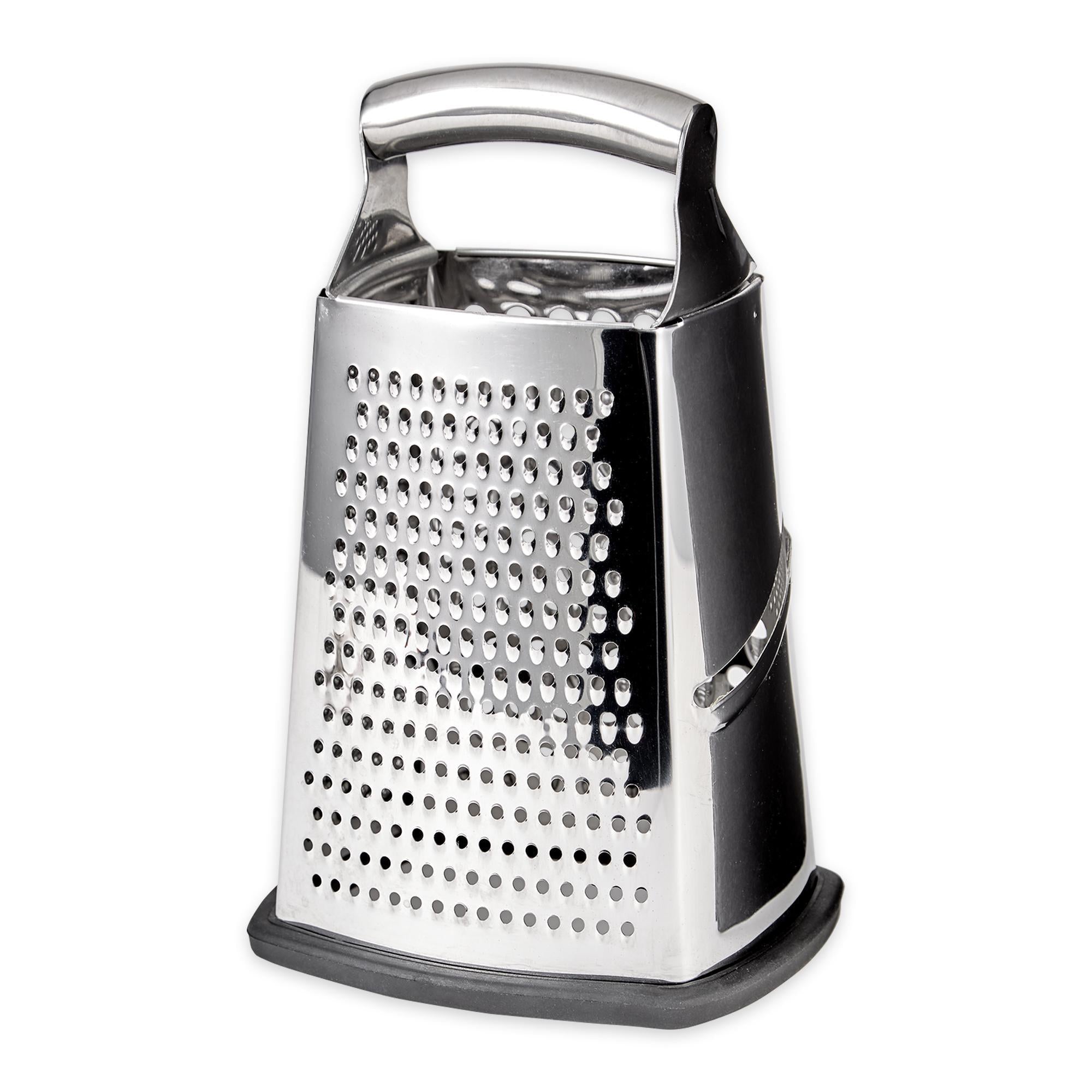 This grater features three grating surfaces and a slicing edge. Made of 18/0 stainless steel with a nonslip silicone base and a large, comfortable handle.