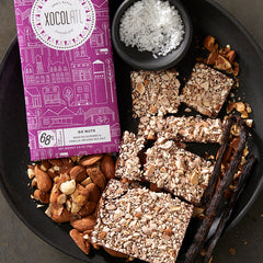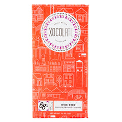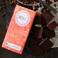 Dark chocolate and coffee perfection. With coffee and espresso beans added to the chocolate only in the last hours of the three-day grind, this bar stays chocolate-forward with a balanced coffee end.