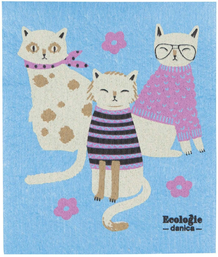 Join the cool cats club by adding this Feline Fine Swedish Dishcloth by Ecologie to your cleaning arsenal. Smart accessories and stylish sweater choices make this fashion-forward trio a force to be reckoned with as you clean your own cat's bowl.