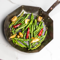 The hybrid pan was forged as a fun experiment but has quickly become a customer favorite due to its usefulness in the kitchen. It is a unique design that combines our polygon skillet’s ideal pour spouts with the sautéing ability of a classic round pan. Even professional chefs find themselves drawn to this useful and beautiful design. This skillet is perfect for the chef who enjoys sautéing and cooking foods that require pouring.