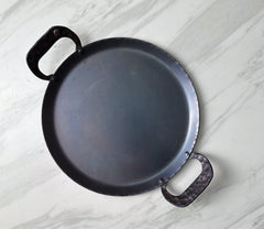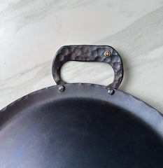 This hand made carbon steel comal is a beautiful and functional piece of kitchenware that is waiting to make it's home on your stove top. Perfect for warming tortillas, making quesadillas, and general cooking that requires a large flay cooking surface. The bottom is pressed and hammer formed form 1/8" carbon steel, and is available with either one or two hand forged handles. It is pre-seasoned and ready to go to work. With proper care and maintenance, this hand forged carbon steel comal can last a lifetime and become a cherished family heirloom.