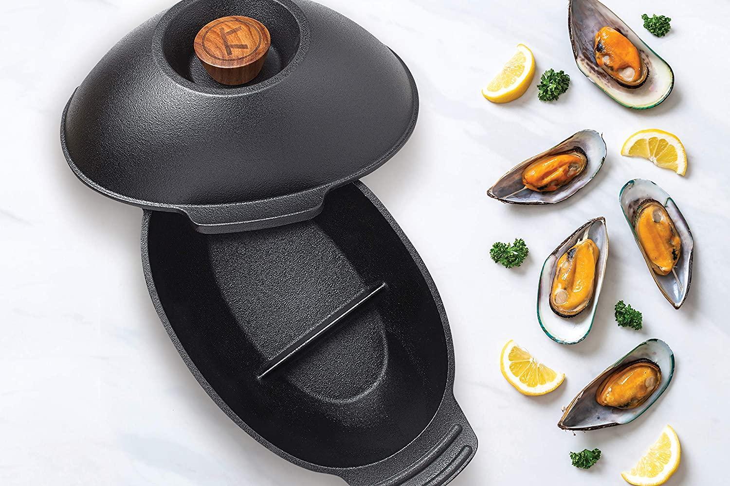 Cooking mussels, clams and seafood dishes has never been easier! Cast a wide net with all the possibilties the Outset cast iron seafood pot with lid has to offer. This multi-functional pot holds 2. 5 quarts of your favorite shellfish, boullabaise, seafood stew or chowders. The interior features a small built-in divider for scooping up broth and oversized handles allow for easy transport from cooking to serving. The lid features side handles in addition to a well appointed Acacia wood top handle which is recessed into the lid, providing a flat surface for stability. Cast iron is known for it's long lasting performance and durability and this cookware set is no exception! It comes pre-seasoned, ready to cook your favorite family recipe or cookbook creations. Elevate your cast iron cookware collection to the next level with this exceptional seafood pot from Outset! For best results, preheat the pot for 10 minutes before cooking. Oven safe up to 400 degrees F (205° C); temperatures higher than 450° F may damage the wood knob.