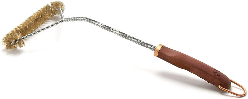 Your grill will be primed to barbecue after cleaning with this traditional and dependable grill brush. Part of an extended family of tools, this brush is down to earth and projects attractive aesthetic features. The three-sided head & long, angled handle make it easy to attack the dirtiest of grills. rosewood handle. Brass bristles.
