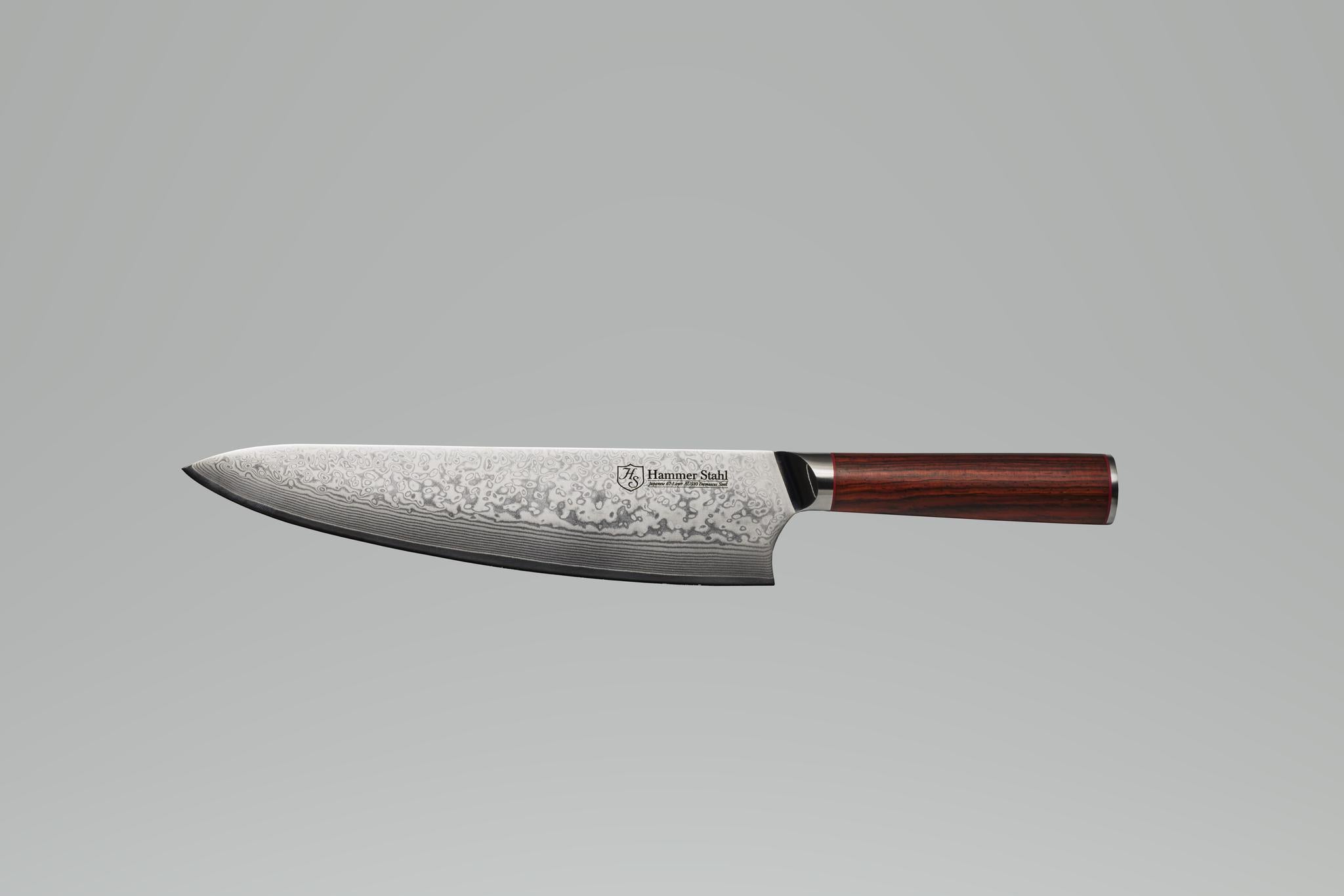Japanese Steel AUS steel featuring 67 layers. 15 degree lasered measure cutting angle. Rosewood Handle.