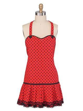 Party Girl Polka Dot red body with black polka dot apron. Black lace trim.