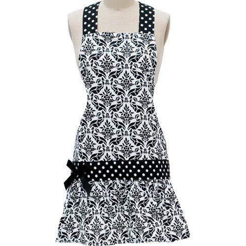 Glam it up with fashion! Protect your clothing in the utmost style with this damask patterned Girlie apron featuring contrasting polka dot drop waist and tie straps.