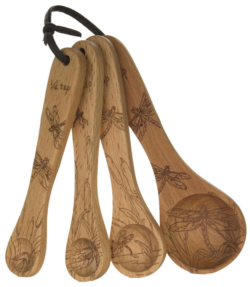 This set of Ganz wooden measuring spoons features dragonflies. Makes for a great decorator item and the spoons are functional as well. Made of sturdy beechwood sealed with soy oil. Includes measures of 1/4 teaspoon, 1/2 teaspoon, 1 teaspoon and 1 tablespoon. Handwashing recommended.