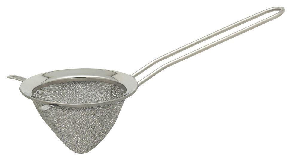 This Double-Ear Conical Tea Strainer strains already-brewed loose leaf tea when pouring it from teapots and other tea steeping vessels. The double-ear frame design steadies it securely in place to pour brewed tea from teapot to a mug or tea cup. This must-have tea accessory filters out the smallest particles for a clean, flavorful cup of tea. It's ideal for black tea, oolong tea, green tea, chai, chamomile, herbal, other types of tea, and mulled spiced hot apple cider, spiced wine, and other drinks that use mulled spice. Made from 18/8 stainless steel, sturdy, durable, reusable, compact, hangs for storage.