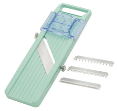 Made in Japan, this adjustable, compact slicer has 3 additional blades to complete all your slicing and julienning tasks with ease. Four different blades cut various shapes and sizes. Straight-edge blade for even slicing. Fine-toothed blade for elegant vegetable garnishes. Medium-toothed blade great for stir fry ingredients. Coarse-toothed blade for chunky cuts. Safety guard protects fingers from blade.