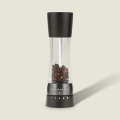 Made from high-quality acacia wood with metal accents, the elegant and tactile Camden salt and pepper grinder set will be sure to elevate any dining table Both salt and pepper mill feature Cole & Mason sharp ceramic grinding mechanism. Grinders are covered by a two-year guarantee. You can easily adjust the salt or pepper grind by tightening or loosening the knob on top of the mill. To refill the grinders, unscrew the knob and pull off the top. The grinders are presented in a plastic free, carton box, making this set an ideal gift. Hints & tips: If your grinder becomes difficult to grind, particularly on a fine setting, trying clearing the mechanism by loosening the knob underneath the mill to the coarsest setting and twist the top. This will free any large salt crystals that may have become lodged. Retighten the knob to the desired setting but be sure to never fully tighten the knob. Clean the grinders with a damp cloth, do not submerge in water. Disclaimer: product comes unfilled.