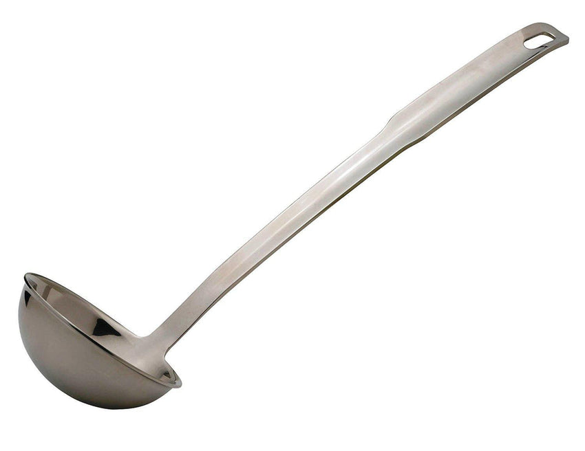 This Stainless-Steel Ladle is a hardworking kitchen utensil that’s perfect for stirring, cooking, serving, saucing and plating foods at every dining occasion. It scoops and serves up generous portions of foods along with their liquids and sauces. Perfect for oatmeal and fruit salad, or ladling gravies, soups and stews, broths, consommes, sauces, salad dressings, and more. Contoured for a comfortable grip, the longer handle easily reaches to the bottom of deeper pots and pans, mixing bowls and other cookware to stir and retrieve every delicious morsel, and keeps hands away from heat. A hanging hole at the end of the handle keeps it conveniently nearby during food preparation or serving, and stores it neatly on a tool rack, out of the way. Whether it’s breakfast, lunch or brunch, or quick meals at home, holiday meals with friends and family, party buffets, or outdoor entertaining. Stainless Steel 18/8 construction. Measures 12.5 x 4 x 3.5 inches.
