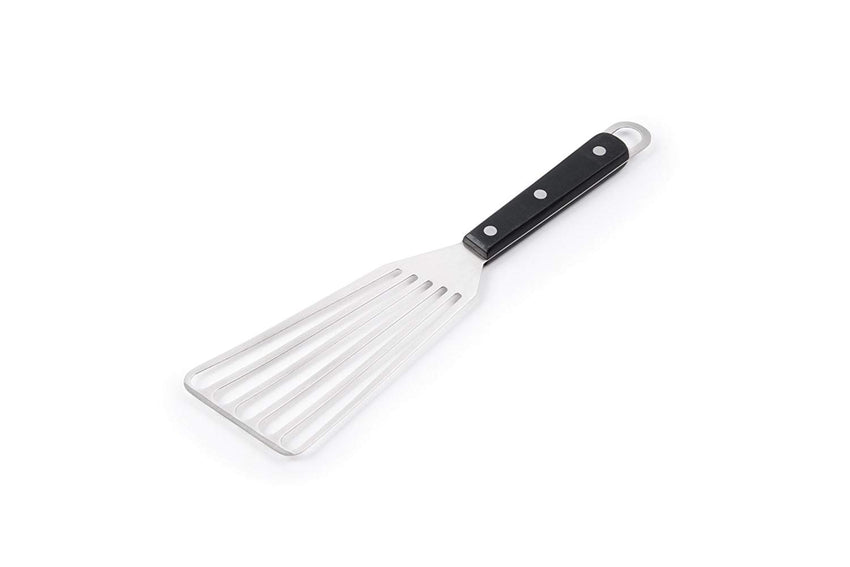 You need a tool that can handle even your most delicate dishes. The The Chef's Slotted Turner is lightweight and razor-thin, specially designed to flip delicate foods and keep them intact. Great for flipping eggs, fish, and crepes, while still being strong enough to lift heavier foods. The turner features a full tang, polished stainless steel construction with three silver rivets to secure the heat and water resistant POM handle, which combines the feel of wood with the easy care of plastic. The 3 x 6 inch head features wide slots to drain liquids when cooking vegetables, scrambled eggs, and more.
