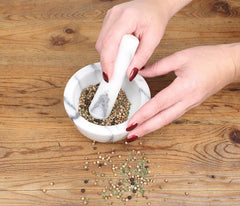 There is no better technique for releasing the aromatic flavors of fresh herbs and spices than by grinding them. This contemporary style mortar and pestle is 2-1/2-inches tall, has a 4-1/2-inch diameter bowl with a 5-1/2-inch long pestle. Capacity is 6-ounces.