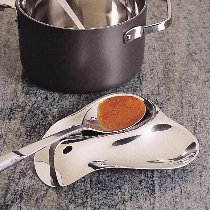 Mirror finish 18/8 stainless steel double spoon rest measures 6-1/4" wide, 7" long and is dishwasher safe.