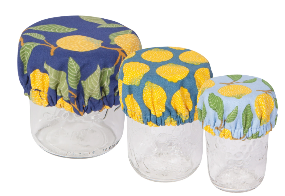 Eliminate the need for plastic wrap by introducing reusable covers for leftovers, batter and more. The lining prevents moisture from escaping and keeps food happy. Remove, machine wash, and repeat. Set of 3.100% cotton exterior with poly blend lining.Measures: 3.5 inch diameter, 4.5 inch diameter, and 6.5 inch diameter