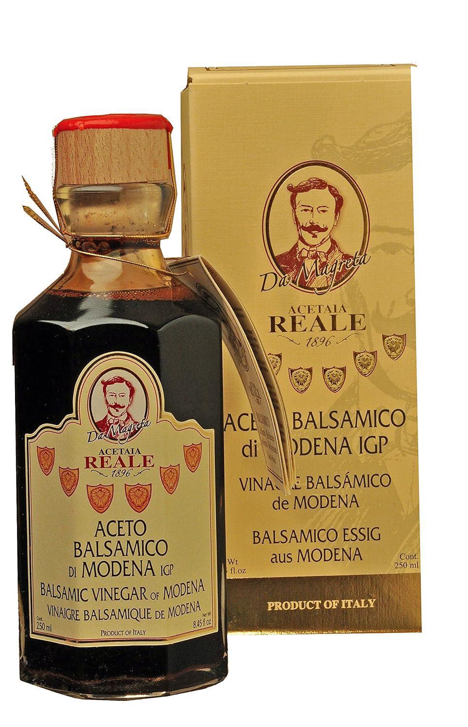 Reale balsamic vinegars are hand crafted without adulteration and aged in wooden barrels. The result over time is a dense, sweet, and pleasantly acidic balsamic with intense flavor. Ingredients: cooked grape must, wine vinegar.