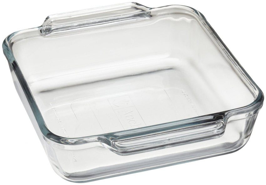 Anchor Hocking glass baking dish that is 8" square, 2" deep, with a 2 quart capacity. Ovenproof, microwave and dishwasher safe. Made in the U.S.A.