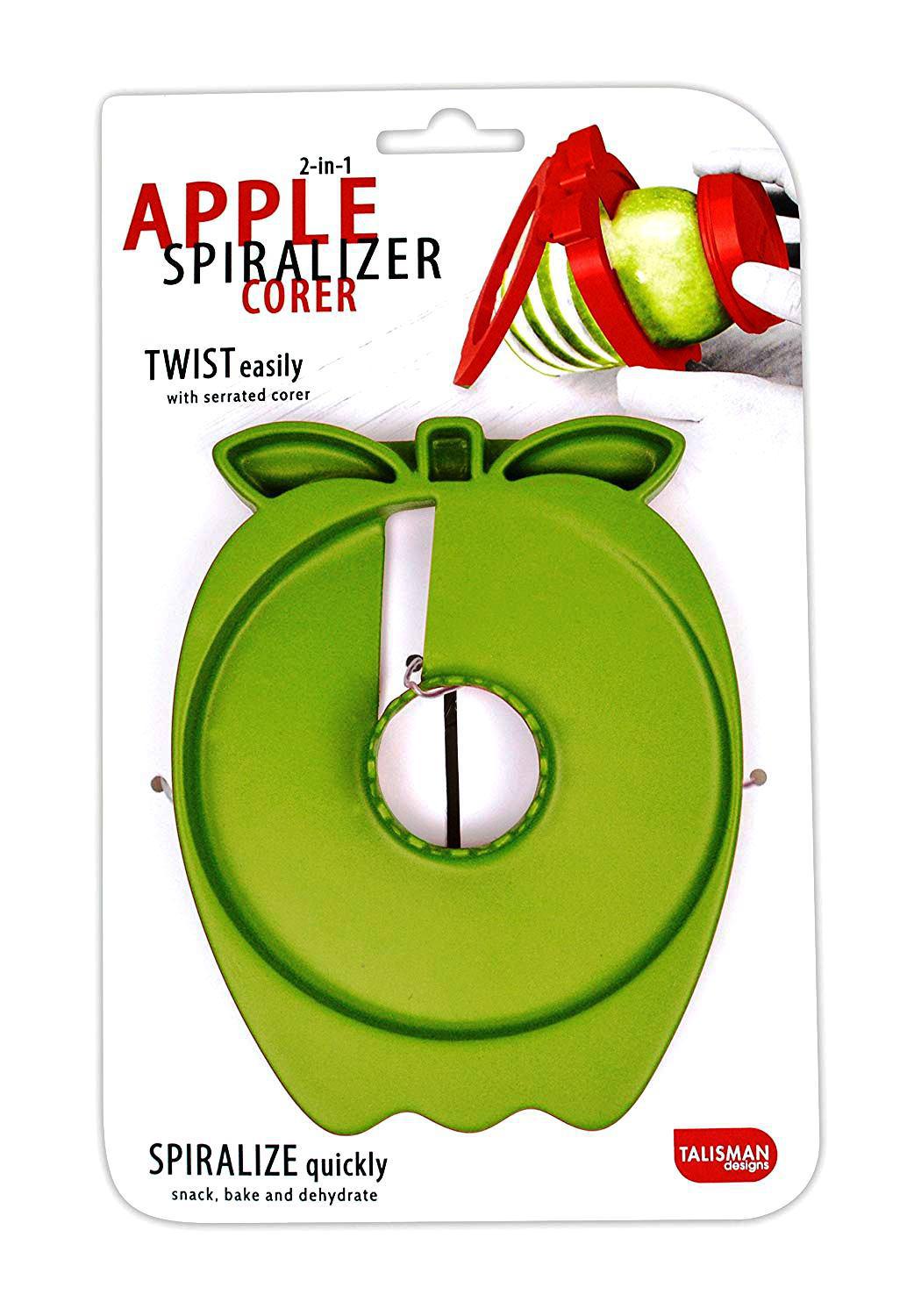 Talisman Designs Apple Spiralizer Corer quickly slices spiral strands from apples and pears while removing the core at the same time. Whether making quick healthy snacks, or baking apple pies, making apple butter, pear tarts, or dehydrating fruit for future use, this handy kitchen gadget takes the work out of food preparation. The clever design consists of no sharp blades, which makes it safe for use by all ages, including kids. The attached stand flips out to add stability while in use, then lays flat for compact storage. It’s so easy to use. Simply center an apple over the serrated corer and use the detachable handle to safely push and twist the fruit to slice and core all at once. Made from FDA-approved, BPA-free nylon, Talisman Designs Apple Spiralizer Corer is dishwasher safe for easy cleanup.