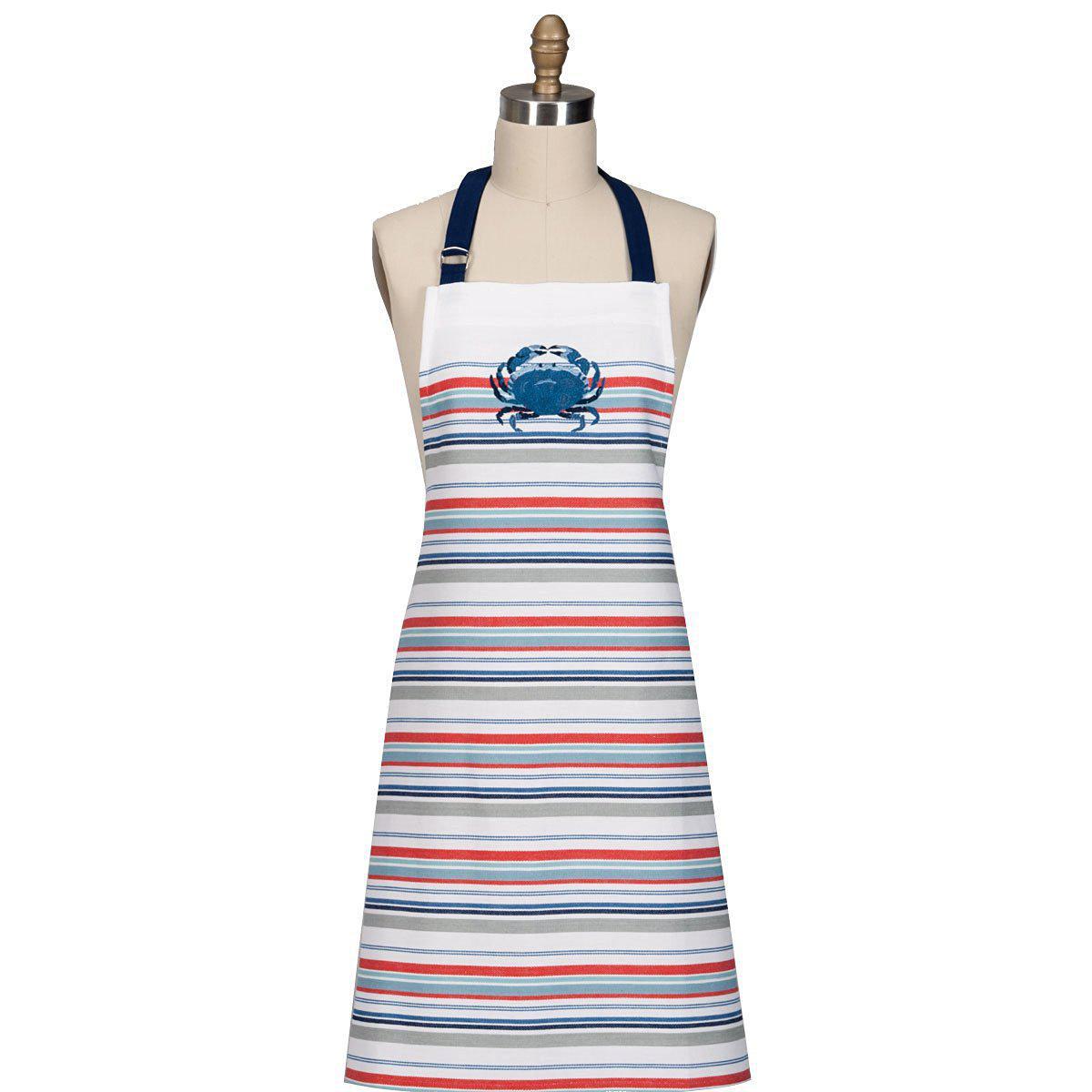 Part of the beach house inspirations collection by artist Lisa audit, this apron features stripes in seaglass colors, and an embroidered crab. Adjustable neck straps.