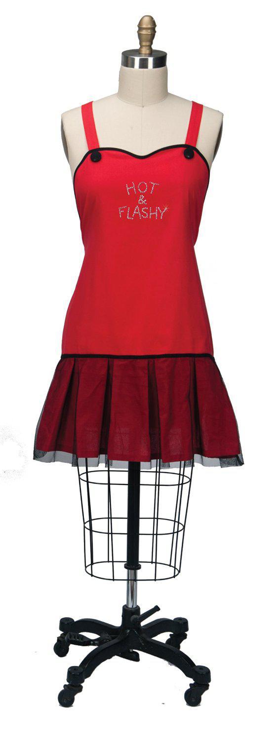 The perfect gift, this hostess apron features Rhinestone detailing declaring "hot & flashy". flattering drop waist silhouette with flirty netting.