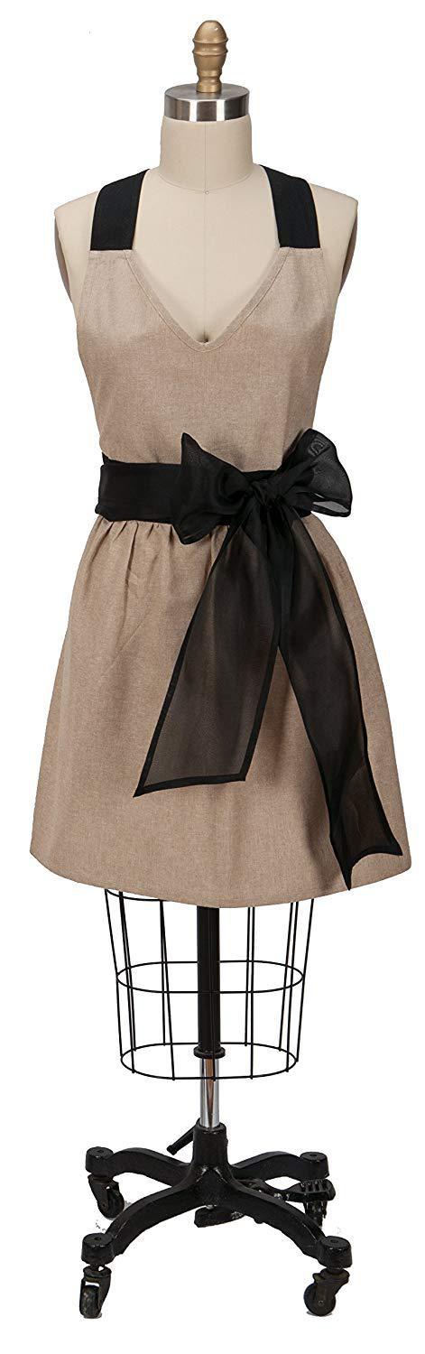 Subtly textured hostess apron with a V-neck and luxurious organza waist strap for gracious entertaining!