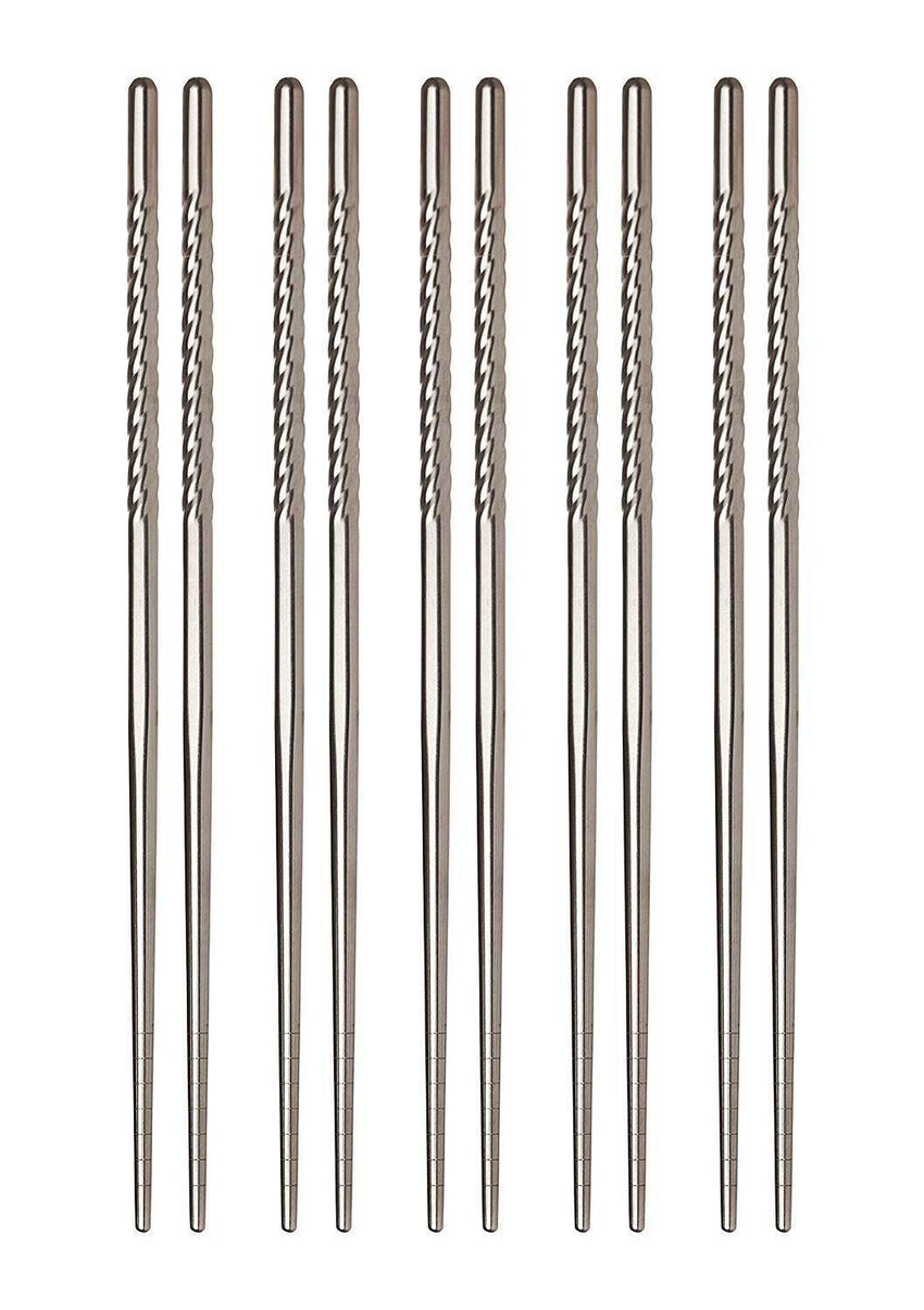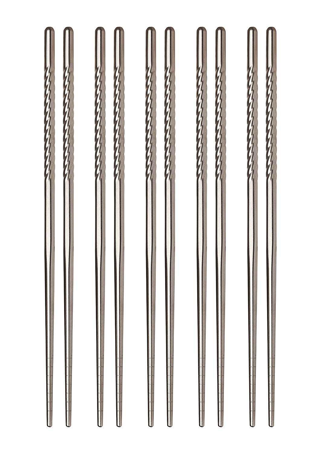 Helen’s Asian Kitchen Stainless Steel Chopsticks make eating Chinese food favorites and everyday meals fun and enjoyable. Lightweight, yet durable, and superbly balanced for fatigue-free use, they complement any dinnerware and other flatware or place settings. Elegant spirals on the handles for a comfortable, non-slip grip and gentle notches on the tapered tips make picking up, and holding onto, foods easier. These stainless-steel chopsticks are hollow to resist heat transfer from hot foods to hands during use and won’t burn, scorch, or discolor. Perfect for tabletop cooking and grilling with a hibachi grill, or Korean bulgogi, Japanese shabu-shabu or sukiyaki and Chinese hot pot. Longer lasting than traditional wooden chopsticks, they won’t react with foods or impart a metallic taste. For much more than eating Chinese food and Japanese food, whether it’s stir-fry, sushi, pad thai, or party hors d’oeuvres and appetizers, foods seem to taste better, and more fun, with chopsticks. Use at every dining occasion, from breakfast to lunch or brunch, for holiday meals, party buffets, even outdoor entertaining. Helen’s Asian Kitchen Stainless Steel Chopsticks resist staining, discoloration and rust, and won’t absorb odors, juices or oils, or transfer flavors between uses. Non-porous surface eliminates worry of cross contamination of food. They are reusable, easy to clean and dishwasher safe. Set includes 5-pair.