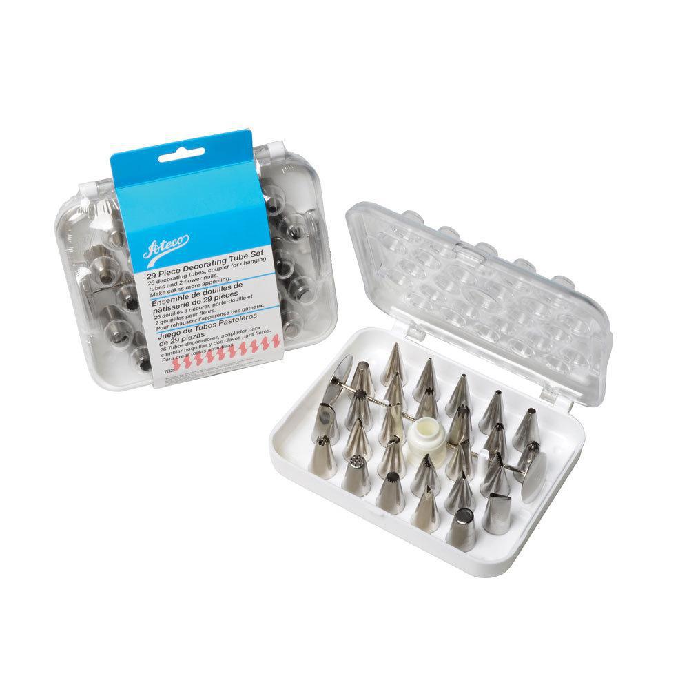 Take your pastry decorating to a whole new level with this Ateco (August Thomsen) 29-piece decorating tube set! This stainless steel set includes a variety of decorating designs, including a tube for writing, stars, leaves, roses, basket weaving, and flowers. Two flower nails and a standard coupler are also included. This entire set comes inside a hinged plastic box, convenient for storage, with instructions for using each tube. Your decorating options are endless with this set!