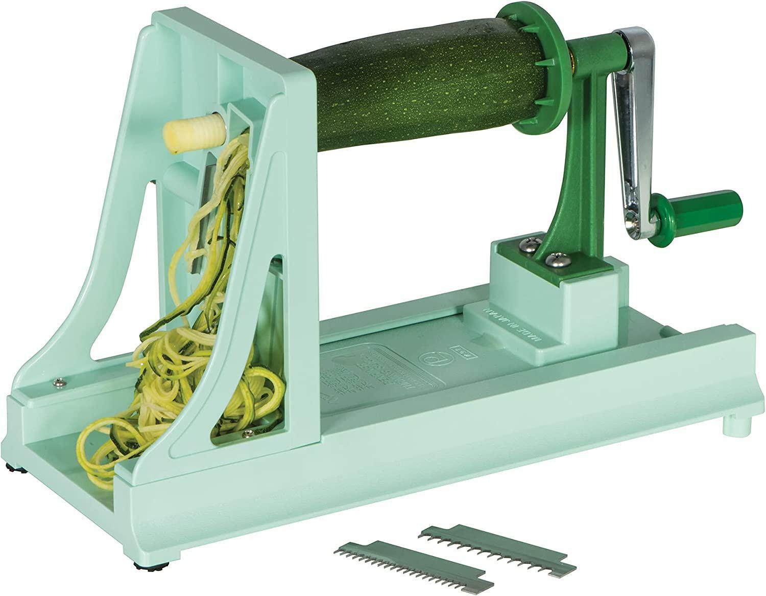 The Benriner Pro turning slicer is used for making fine cut carrots potato strings for salad strings of green pepper or beets and curly strands of cucumbers. Made of safety high quality nylon and reinforced glass it includes four stainless steel blades; a flat-edged blade, a fine-toothed blade, a medium-toothed blade, and a coarse-toothed blade. You can make fifty servings in 5 minutes and it does not waste any vegetable material. The Benriner Pro turning slicer peels various vegetables that wedge into the center spike with an adjustable thickness of cut. Turn the handle only to produce fine strings of carrots onions cucumbers peppers etc. The fine blade creates elegant vegetable garnishes for professional looking meals. Prefect for carrots radishes or any other firm vegetable. The medium blade is excellent for quick and easy uniform stir-fry pieces suitable for almost any vegetable including onions peppers radishes beets zucchini etc. The coarse blade makes chunky and crisp cuts of fruits and vegetables such as potatoes onions radishes cucumbers carrots apples peaches etc.