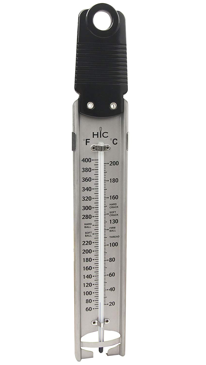 The Candy/Deep Fry Thermometer is an invaluable addition to cooking utensils and chef tools for all types of foods. Using a thermometer ensures correct temperatures so that foods cook properly. Ensuring food safety is essential regardless of cooking technique. This Easy-Read Candy/Deep Fry Thermometer, with universal temperatures in both Fahrenheit and Celsius, takes accurate temperature readings (between 60 and 400-degrees Fahrenheit) for precision cooking. Perfect for deep frying doughnuts, French fries, fish, chicken, jelly, it even features easy-reference indicators for candy making, from thread to soft ball, firm ball, hard ball, soft crack, and hard crack. Easy to use. Clip the thermometer to the inside rim of the pot. For an accurate temperature, submerge the point of the stem (at least 2-inches) without it touching the bottom of the pot and cook food according to recipe. Made with stainless steel frame, glass tube and heat-resistant handle, durable and compact for easy storage. Hand wash in warm, soapy water.