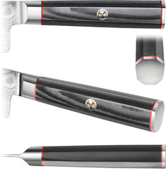 Exceptionally sharp, and striking in design, these hand-sharpened blades feature a unique 67-layer Damascus pattern across the face of the X-7 high-alloy full-tang blades. Rich, ultra-dense gray G10 handles balance each knife while providing exceptional comfort and precision for the chef. Each knife comes with a rich gray wood magnetic Saya-style sheath that is perfectly shaped to match and protect the knife's distinct blade.
