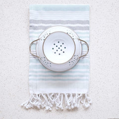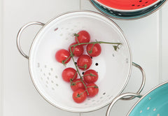 Now Designs's designer metal colanders are a practical way to add a splash of color to your kitchen decor. This 1-quart white bowl is fashioned with quick-draining holes for washing and straining lettuce, berries, and pasta over your sink. This colander has a powder-coated metal finish with stainless-steel rim and handles. A concave lower stand with level base promotes stability even on precarious work surfaces. Food safe.