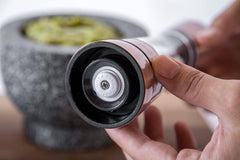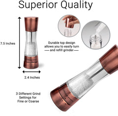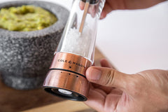 The Cole & Mason 7.5 inch Copper Derwent Gourmet Precision Salt and Pepper Mills evoke the chef’s kitchen with a modern acrylic hourglass display. The peppermill uses premium hardened carbon steel millworks to bring user-friendly spice control to your table with six distinct settings, from fine powders to coarsely sliced and ground gourmet chunks. The Derwent pepper grinder is easy to refill by just lifting the top straight up and the grinding mechanism is guaranteed for life.