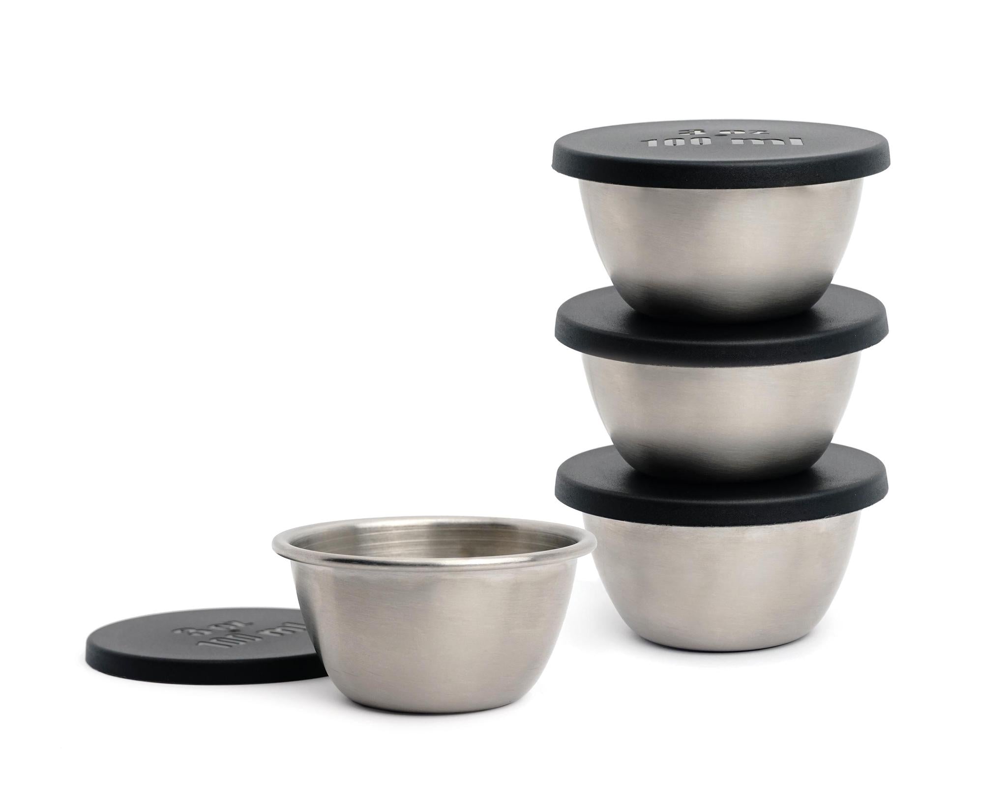 This set of 4 stainless steel cups with lids has a multitude of uses from holding prepped foods to storing small amounts of dressing, dips, condiments, or home-made herb and spice blends. The cups are made from 18/8 stainless steel, snug-fitting lids are made from LDPE plastic which is BPA-free....