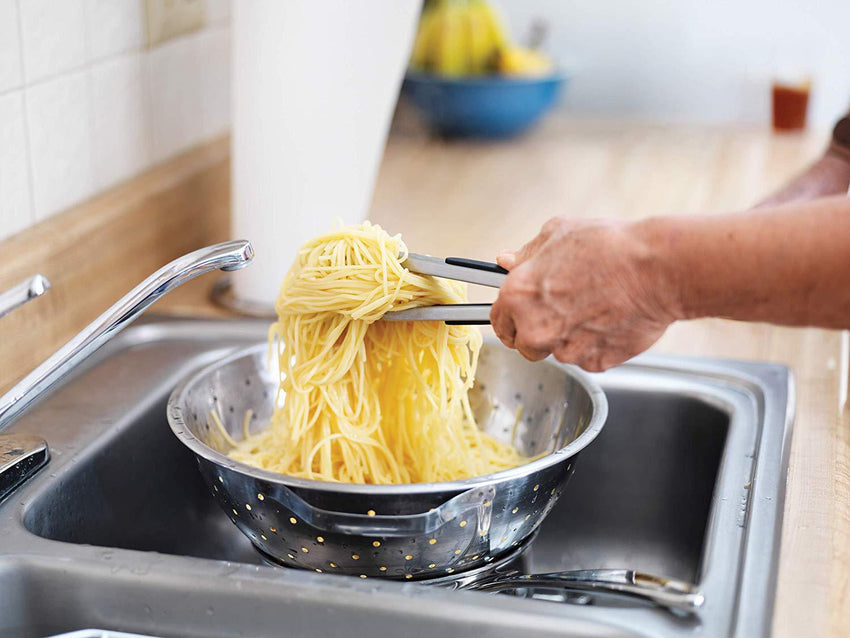 Cutlery Pro's Locking Tong with silicone blades securely grips, lifts, turns, and drains cooking liquids from foods for mess-free serving. A helpful addition to kitchen utensils, it is perfect for cooking, serving and plating foods at every dining occasion. Scalloped grips hold foods securely and drain liquids and cooking oils for mess-free serving. Lift and turn foods with confidence. Cook and serve without the drippy mess. Safe for non-stick pots and pans. Great for cooking meat and poultry, fish, even veggies and stir-fry, tossing salad, and so much more. Sturdy and durable, their spring action keeps them open and ready to use. Just a quick pull of the locking ring keep them closed for easy, compact storage.