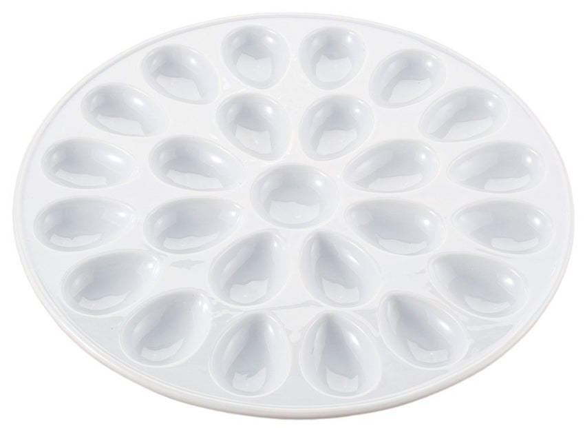 Beautiful whitewares are versatile. They go with any décor and they spotlight your culinary creations. When you spend so much time preparing attractive and colorful snacks and dinners don’t lose them to pattern and color. Imagine deviled eggs – full of paprika and lovely yellows – on an ordinary blue dinner plate; it’s a sure way to stifle the delight and wonder of your colorful treat. With HIC’s porcelain you can frame your food with beautiful whiteware and put the spotlight on the food, itself. The HIC Deviled Egg Dish is perfectly sized for your holiday party. It holds 24 eggs and features a center opening for salt or seasoning. It’s made of porcelain and its extremely durable. Take this dish with you, wherever you want and need it. It is microwave, freezer and dishwasher safe. Bring your culinary treats and masterpieces from the kitchen to your guests, beautifully framed in HIC porcelain, and your guests will see and taste the difference.