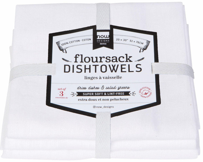Fill your linen drawer with the perfect simplicity of these White Flour Sack Towels by Now Designs. Their crisp white color meshes perfectly with any kitchen space. These soft floursack dishtowels are ready to tackle all cleaning duties. Set of three in gift-ready packaging make perfect housewarming and hostess offerings. The MVP towel of the kitchen, this humble yet powerful towel is bigger, softer, thinner, lint-free and cute for good measure. You can never have too many simple white cloths to help around the kitchen.
