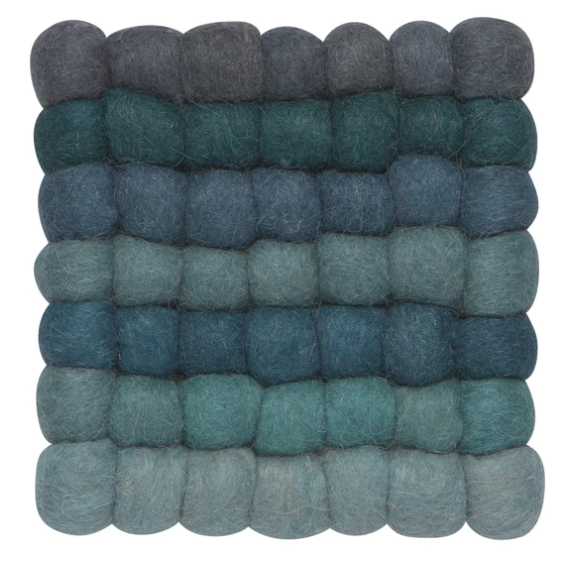 Ombre colors create a kaleidoscope pattern on these cozy woolen trivets. Each sphere is hand-felted and connected creating an unusual, textural statement for the kitchen or table.Measures 6" x 6"90% Recycled Felt 10% Polyester