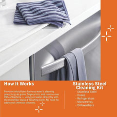 All you need to keep stainless steel looking as good as its name, this E-Cloth kit includes 1 Stainless Steel Cloth and 1 Glass & Polishing Cloth. Masses of premium microfibers harness water's cleaning power to grab grime, fingerprints, and over 99% of bacteria — using just water. There’s no need for messy pastes, single-use wipes, or sprays that could linger in the air you breathe. The cleaning cloth has two sides — striped for brushed stainless steel and solid for polished stainless steel. Just dampen and wipe. Then follow with the Glass & Polishing Cloth to absorb moisture, water spots, and streaks, restoring a like-new finish with just a few swipes. Rinse cloths between uses. Toss in the laundry — not a landfill — to refresh. Manufacturer guaranteed to last for 1 year or 100 washes, the E-Cloth Stainless Steel Cleaning Kit helps you cross paper towels and additional cleaners off your shopping list for good.