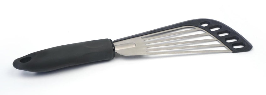 Use this silicone edged slotted spatula to easily flip and maneuver delicate foods such as fish and eggs. The angled shape makes it easy to slide under food and the slots allow draining. Heat safe up to 450°F/250°C.