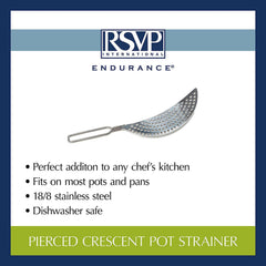 This perfect additon to any chef's kitchen features a crescent design that will fit on most pots and pans. Non-directional handle allows for left- and right-handed users. Made of heavy and durable 18/8 stainless steel. Strainer is 9-1/2-inches, and the handle adds 6 inches. Strainer holes are approximately 1/4-inch in diameter.Dishwasher safe