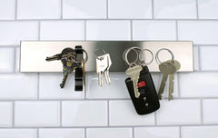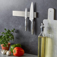 This magnetic Knife holder has a strong, full surface magnet that holds several items securely. The 18/8 stainless steel satin finish complements most kitchen styles for a sleek modern look and excellent storage capability to showcase your cutlery. Includes mounting hardware.