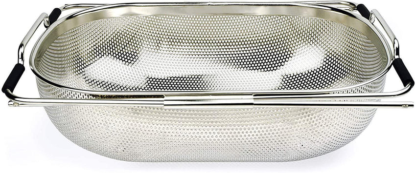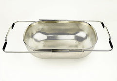 This over-the-sink drainer extends from 14.5" to 22". Contructed of 18/8 stainless steel with rubber grips on the handles. Dishwasher safe.