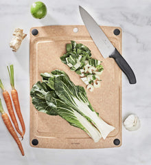 The best features of Epicurean's most popular boards were combined into the All-in-One Cutting Board Series. Utilize both sides of the board; use the juice groove side to catch excess liquids or flip the board over if you need even more space. The four non-slip silicone feet keep the board secure either way.