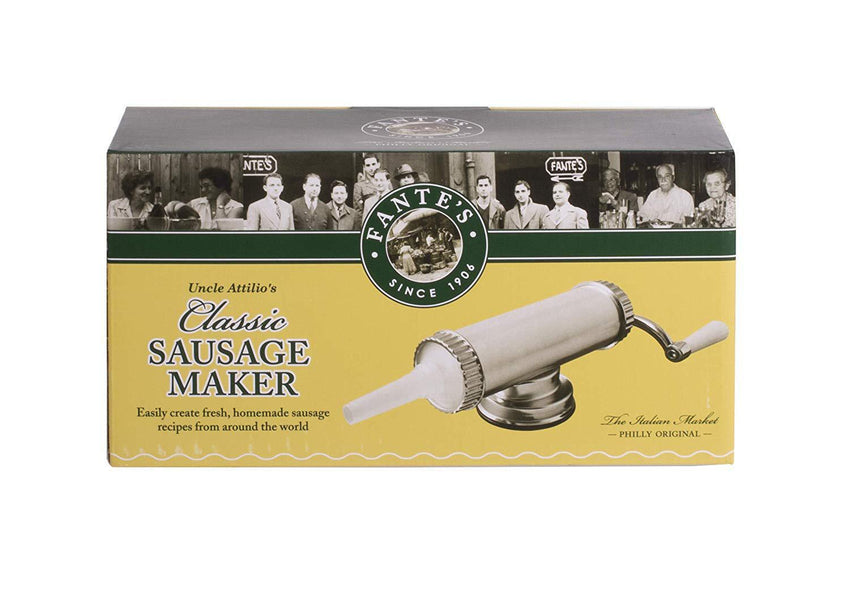 Fantes Uncle Attilio’s Sausage Maker easily creates fresh, homemade sausage recipes from around the world at home. Quickly customize delicious flavor and meat combinations, and control fat content and quality for tastier homemade sausage results. The real fun of sausage making is to experiment for unique variations. Try different add-ins, like apples, cheeses, and vegetables, all chopped small enough to fit through the nozzle opening. Includes 3 nozzle sizes (15, 19, and 22-millimeter diameter) to make thin, regular, and plump sausage links. The crank-style handle makes operation simple. The suction base secures to any nonporous surface for easy setup and added stability during use. Simply secure suction base to work surface. Fill the Sausage Maker canister with sausage meat. Slide the entire casing length onto the desired size nozzle and turn the handle to fill. Make sure to guide the filled sausage by hand to prevent it from breaking. Tie both ends at desired lengths to secure the stuffing inside. Includes Sausage Stuffer with suction base, 3 nozzles (15, 19, and 22-millimeter diameter), complete instructions, and a Fante’s family recipe. Disassembles for easy cleaning. Hand wash in warm, soapy water.