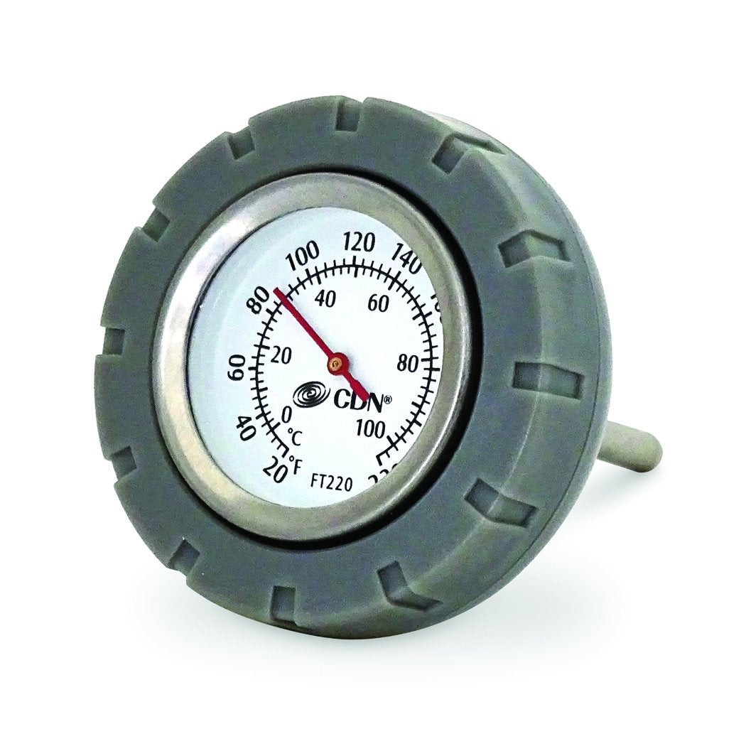 A variety of culinary projects hinge on the ability to keep a liquid at just the right temperature - from brewing beer to baking a delectable cheesecake in a water bath. This specialty thermometer is the perfect companion for best results for sous-vide cooking or any recipe requiring a water bath. For brewing beer, water baths are used to improve beer taste by controlling the temperature of the fermentation process. This multipurpose floating thermometer will also come in handy for sauces, soups and stews. Totally waterproof, the Floating Thermometer features the quality construction for which CDN is known, with a sturdy polycarbonate lens and 304 stainless steel housing. It is enclosed in a stay-cool buoy that floats on the surface of a liquid and is removable for easy cleaning. Range 20 to 220°F/0 to 100°C
