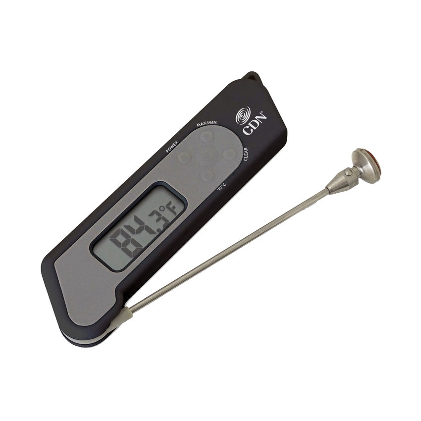 CDN presents the quick, precise and handy Quick-Read Surface Grill Folding Thermocouple Thermometer (TCT572) featuring a highly durable design that is water resistant, shatterproof, and is manufactured with BioCote, an antimicrobial agent. With its 19 mm sensor disc, large digital readout and easy-to-press buttons, this thermometer has rapid response for...